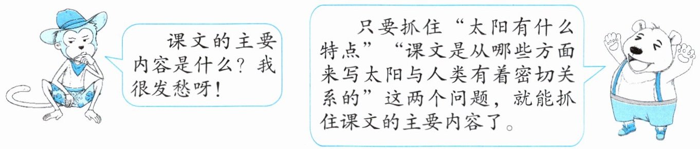 课文的主要内容是什么?我很发愁呀!只要抓住“太阳有什么特点”“课文是从哪些方面来写太阳与人类有着密切关系的”这两个问题,就能抓住课文的主要内容了。