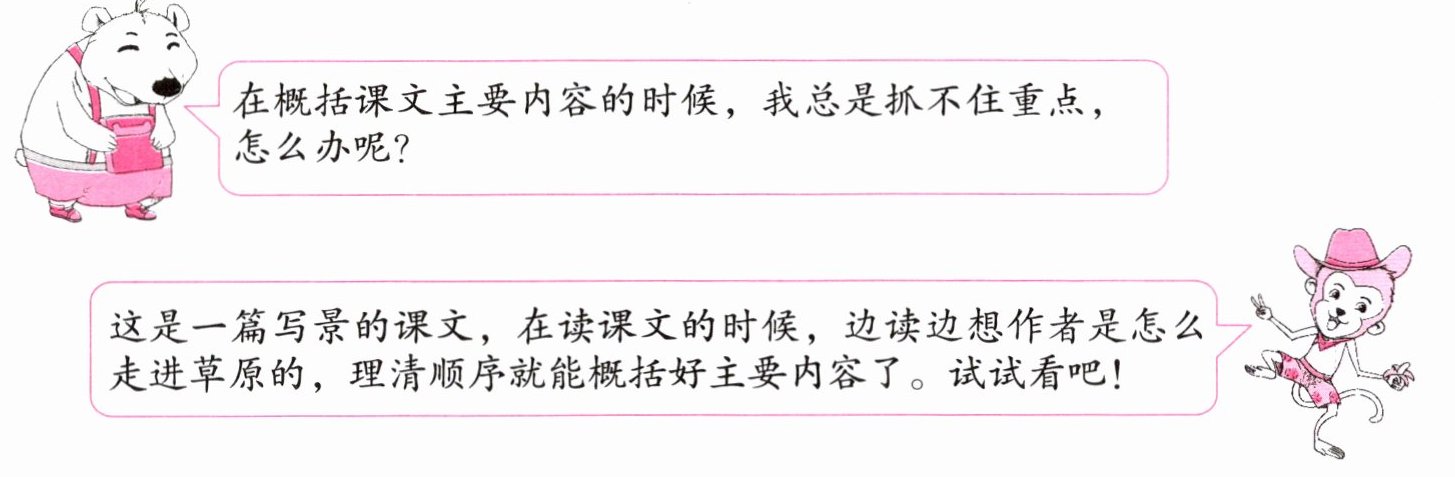 这是一篇写景的课文,在读课文的时候,边读边想作者是怎么走进草原的,理清顺序就能概括好主要内容了。试试看吧!