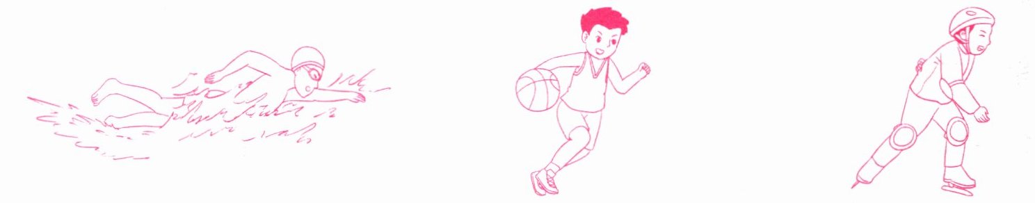 swim (游泳) play basketball (打篮球) skate (滑冰)