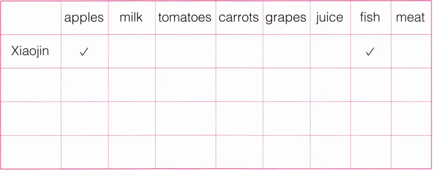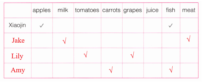 apples milk juice meat fish tomatoes carrots grapes(无先后顺序要求)