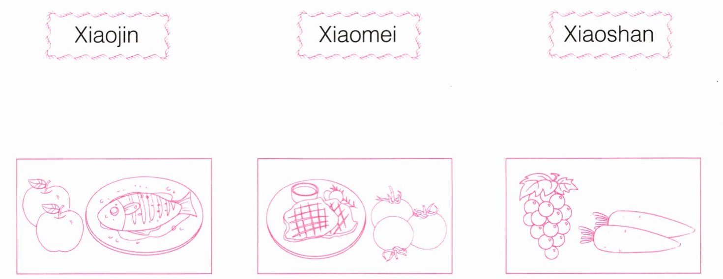 五、小晋和妈妈从超市买了各种食物,看看有些什么。