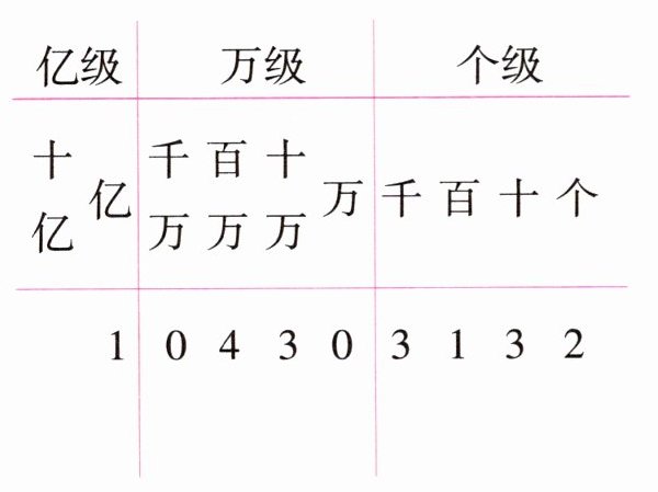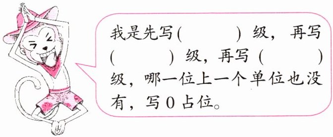 先写(亿)级,再写(万)级,再写(个)级,哪一位上一个单位也没有,写0占位。