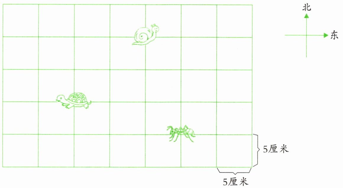 蚂蚁位于从左往右数第4列,从下往上第2行,蚂蚁向东走0格,向北走3格到达蜗牛家,连接相应路线图即可(一般题目要求为画图题时,答案中不呈现图片)。