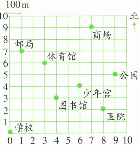 (1)体育馆(3,6) 商场(7,9)图书馆(4,3) 少年宫(6,4)公园(9,5)