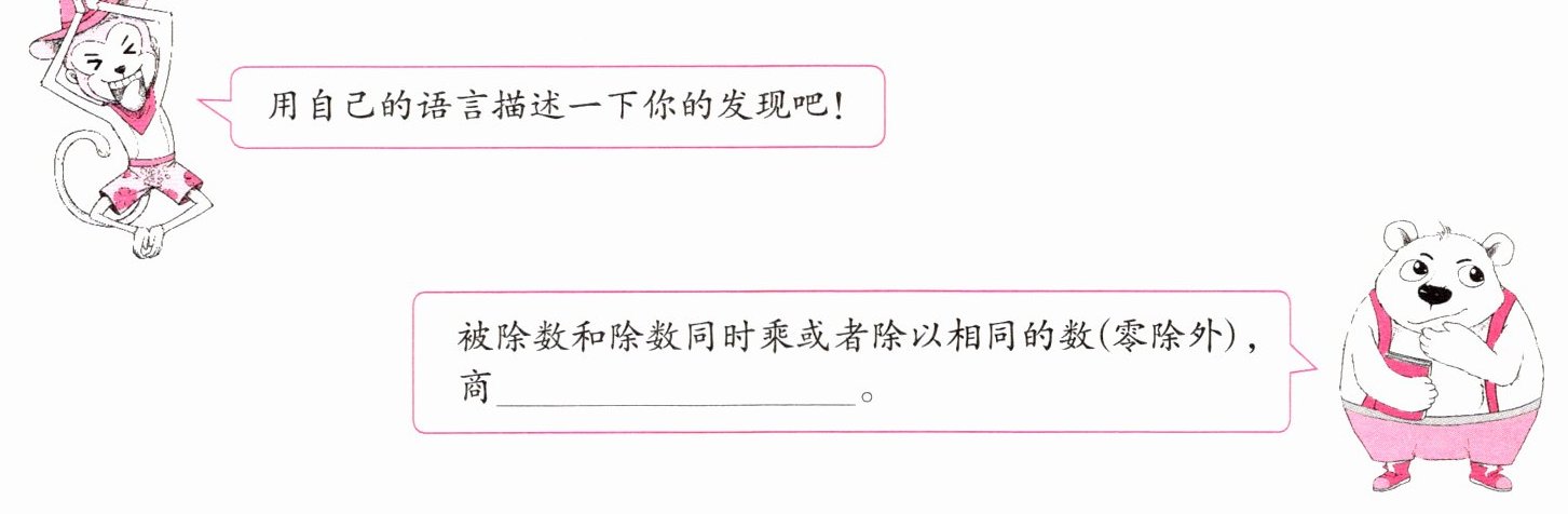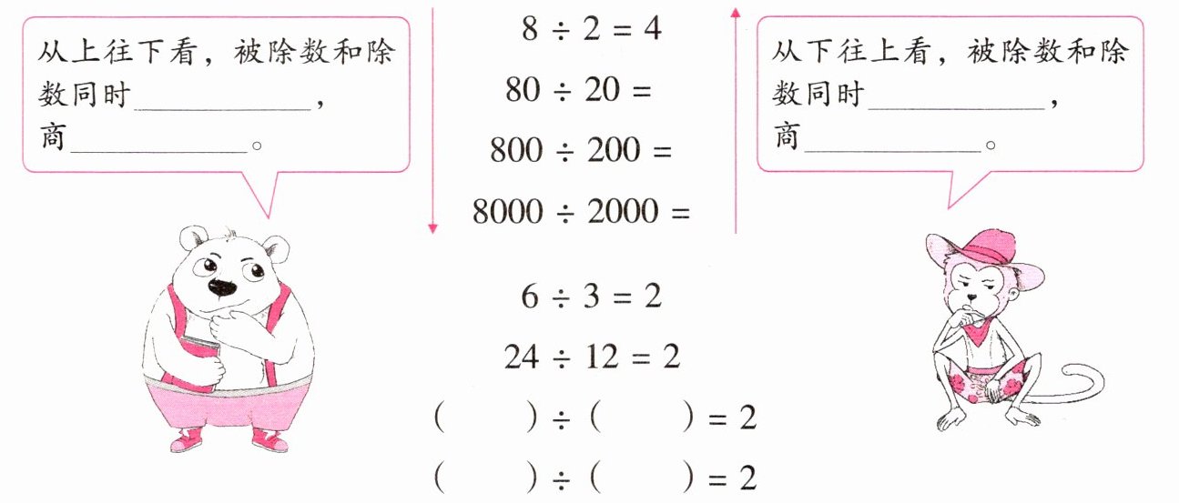 80÷20=4;800÷200=4;8000÷2000=4 从上往下看,被除数和除数同时乘相同的数(0除外),商不变。 48÷24=2;96÷48=2(答案不唯一,只要被除数和除数同时乘相同的数即可) 从下往上看,被除数和除数同时除以相同的数(0除外),商不变。