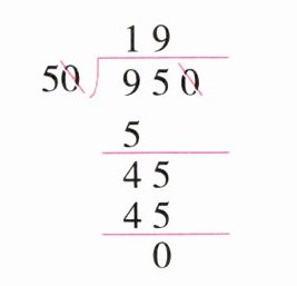 @@$950 ÷ 50 = (950 ÷ 10) ÷ (50 ÷ 10) = 95 ÷ 5 = 19$还可以这样做:$\begin{array}{r}19\\ 50\overline{)950}\\ 50\\ \hline 450\\ 450\\ \hline 0\end{array}$根据商不变的规律,被除数和除数同时除以$10$,商不变,所以可以这样计算。