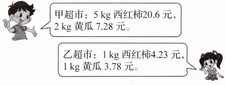甲超市:5 kg 西红柿20.6 元,2 kg 黄瓜7.28 元。