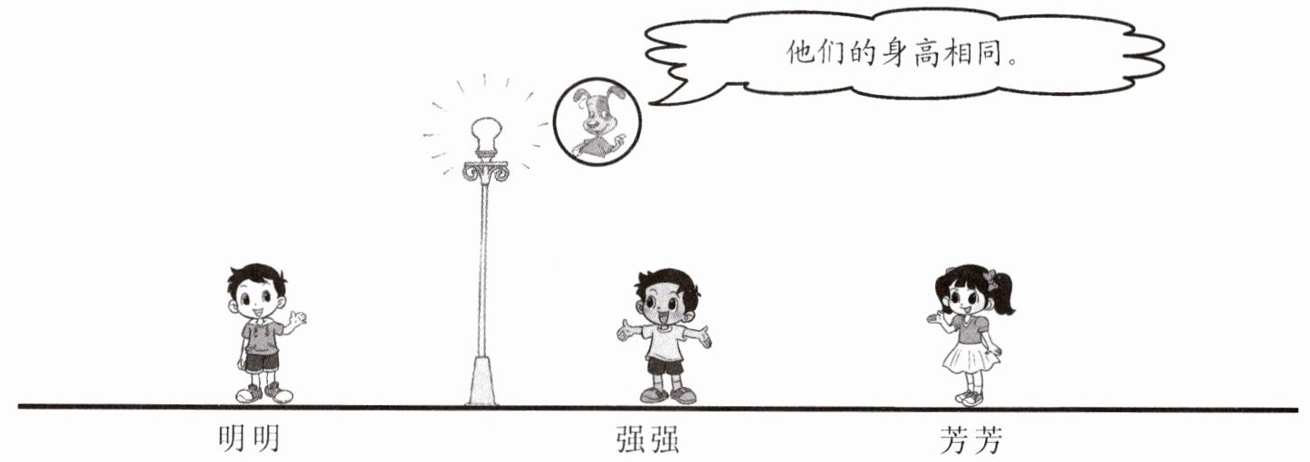 (2) 同一光源下,身高相同的人,离光源越远,影子越长;离光源越近,影子越短。芳芳影子最长,强强影子最短。