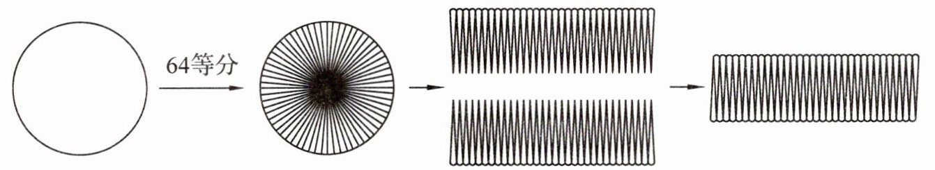 (1)在上图中,平行四边形的底,相当于原来圆的( ),平行四边形的高,相当于原来圆的( )。