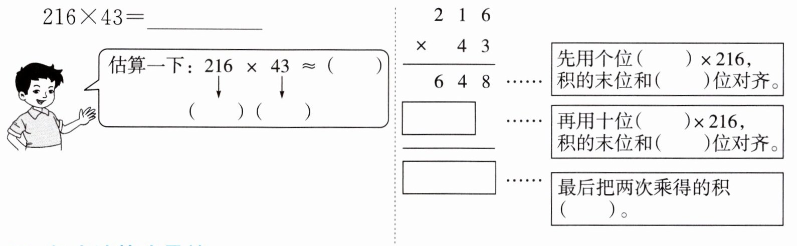 $\begin{array}{r}216\\×\ \ 43\\\hline648\\\underline{\quad\quad}\\\underline{\quad\quad}\\\end{array}\\\underline{\quad\quad}\\\underline{\quad\quad}\\ $