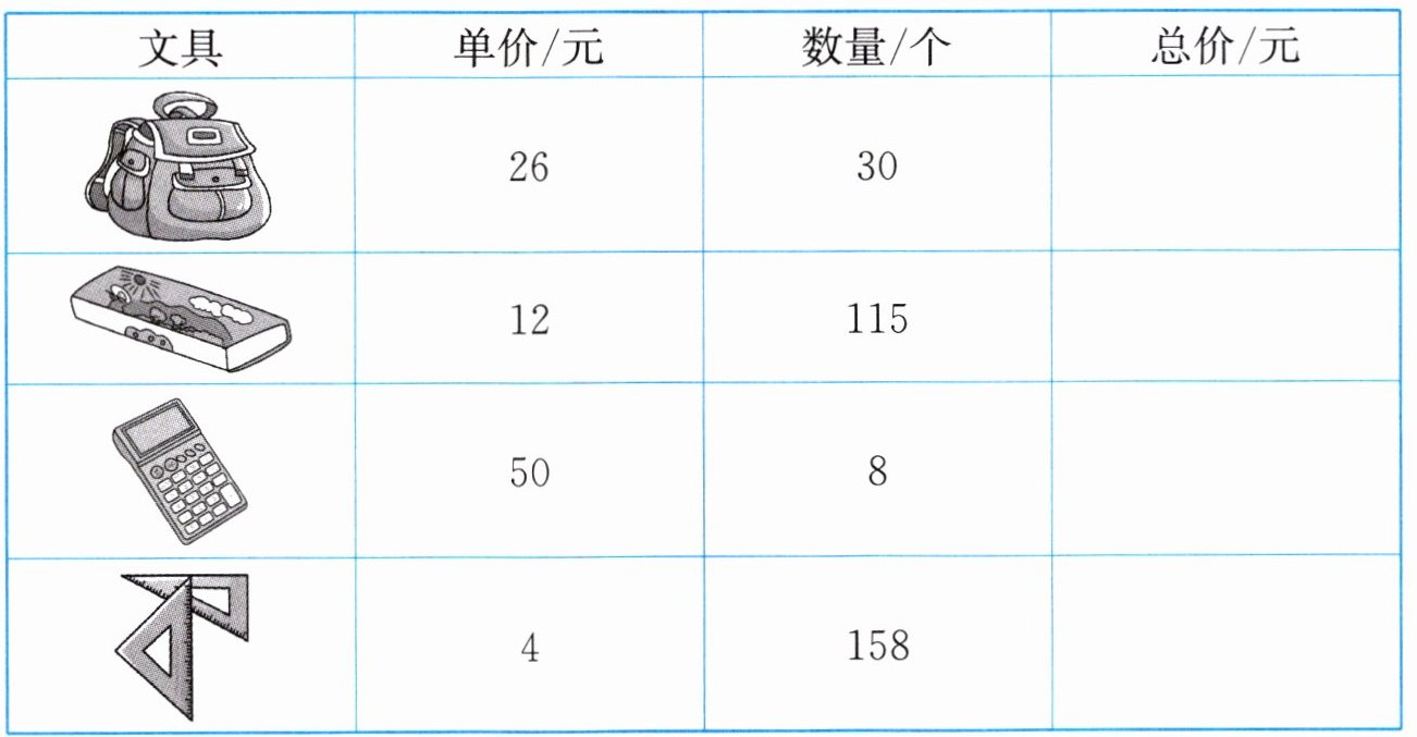 1. 每件商品的价格,叫作( );买了多少,叫作( );一共用的钱数,叫作( )。( )×( )= 总价。