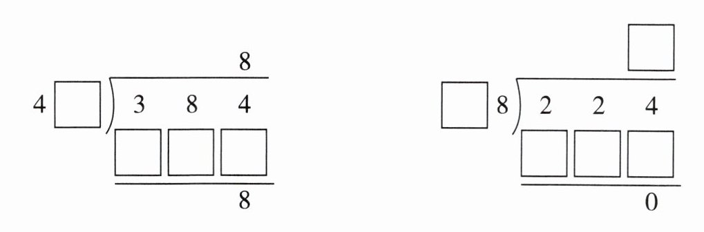 第一个竖式除数方框填7,积为376;第二个竖式商填8,除数方框填2,积为224。