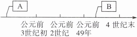 (1)①A:公元前450年左右;B:公元前27年。②地中海地区;罗马帝国分裂为东西两个帝国。