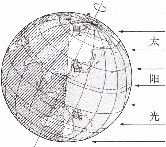 。(2)在图中晨昏线两侧相应位置标注“白昼”和“黑夜”;在地轴上画出地球的自转方向。