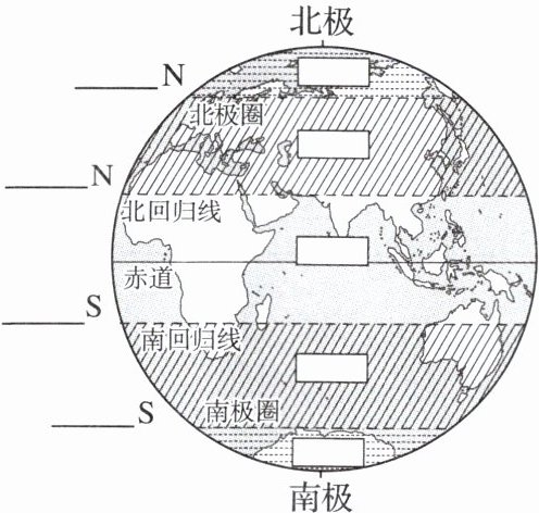 3. 人们根据各地获得太阳光热的多少,把地球表面划分为五个带,读教科书第 25 页,在下图中方框内填写五带名称并标注界线纬度。