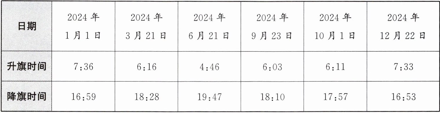 我们共同搜集了天安门广场升降旗时间的资料,如下表所示。