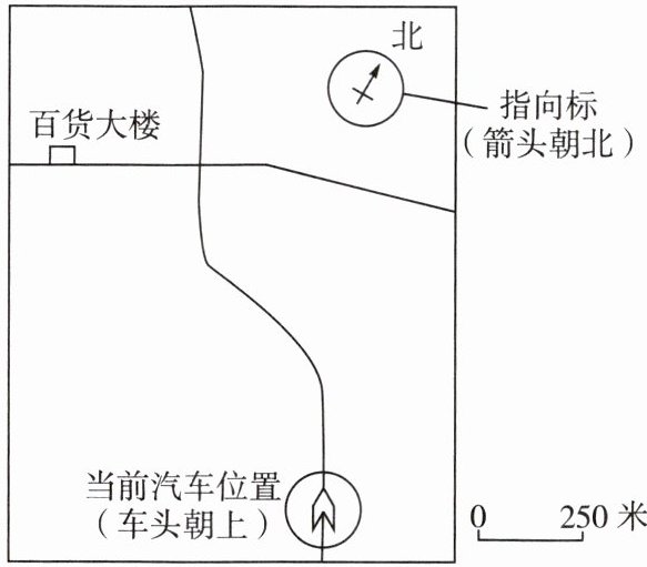 2. 若汽车从图中当前位置行驶到百货大楼的图上距离为5厘米,则实地距离为(