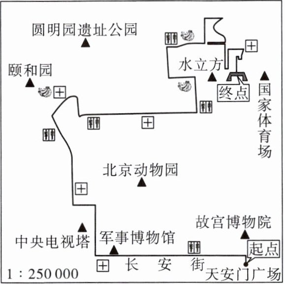 2023年10月29日,2023北京马拉松暨全国马拉松锦标赛(北京站)在天安门广场鸣枪开跑。读比赛路线示意图,完成3~5题。