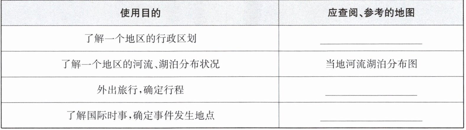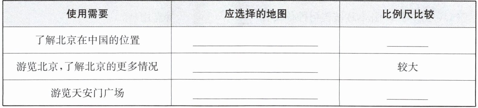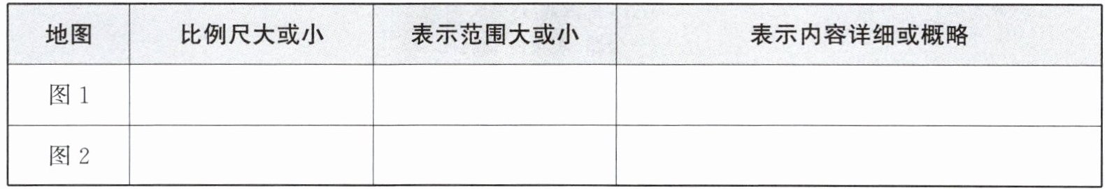 2. 认识比例尺大小与范围、内容详略之间的关系。读图,填写下表。