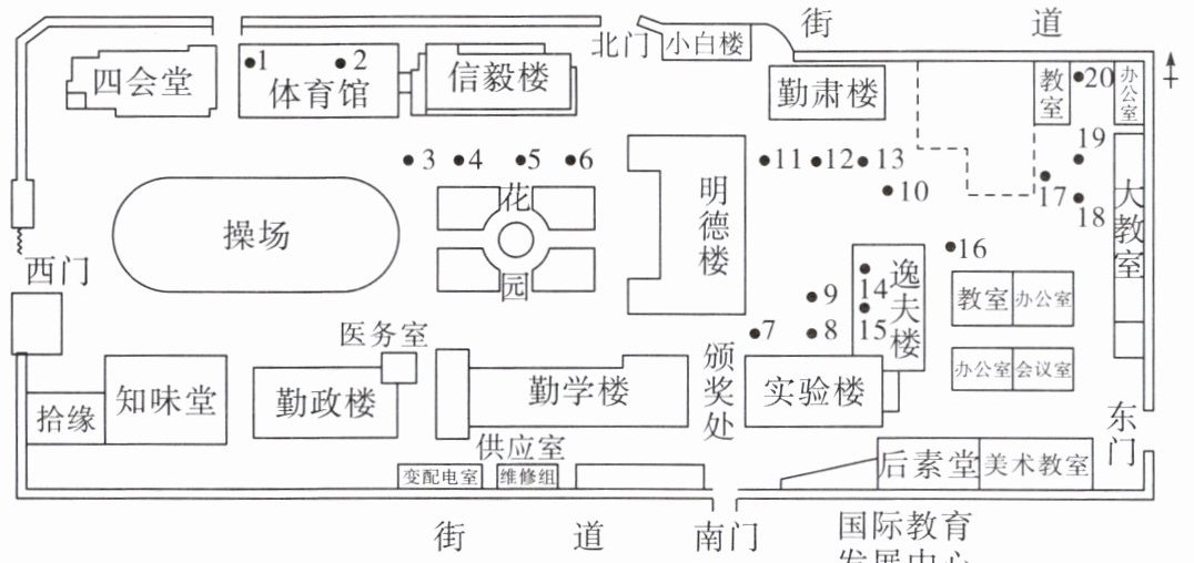(4)起点为信毅楼,第一站去往体育馆体验项目1,第二站去小花园前(或信毅楼前)参加项目4,第三站去勤肃楼前参加项目13,第四站去大教室前参加项目19,第五站去逸夫楼内参加项目15,第六站去实验楼外参加项目7,最终回到颁奖处领奖。(答案合理即可)