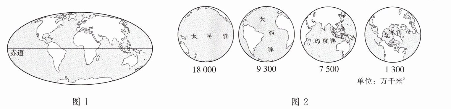 2. 在图 1 中适当位置填注四大洋的名称,比较图 2 中四大洋的大小。