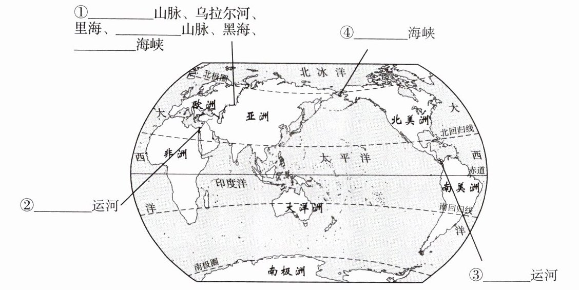 ①乌拉尔 大高加索 土耳其 ②苏伊士 ③巴拿马 ④白令