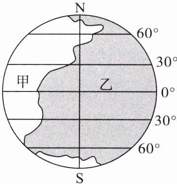 B 解析 南极附近是南极洲,为白色区域,北极附近是北冰洋,为灰色区域,所以可以判定,甲表示陆地,乙表示海洋。低纬度地区和中纬度地区海洋面积都大于陆地面积。