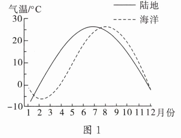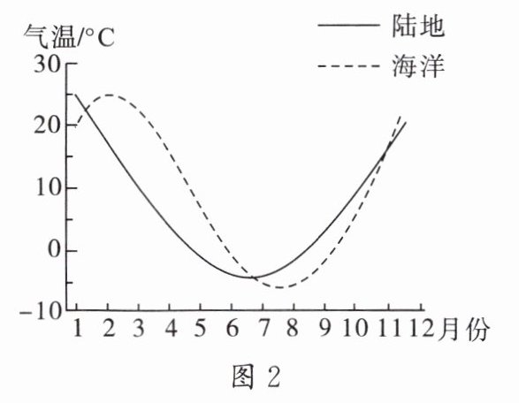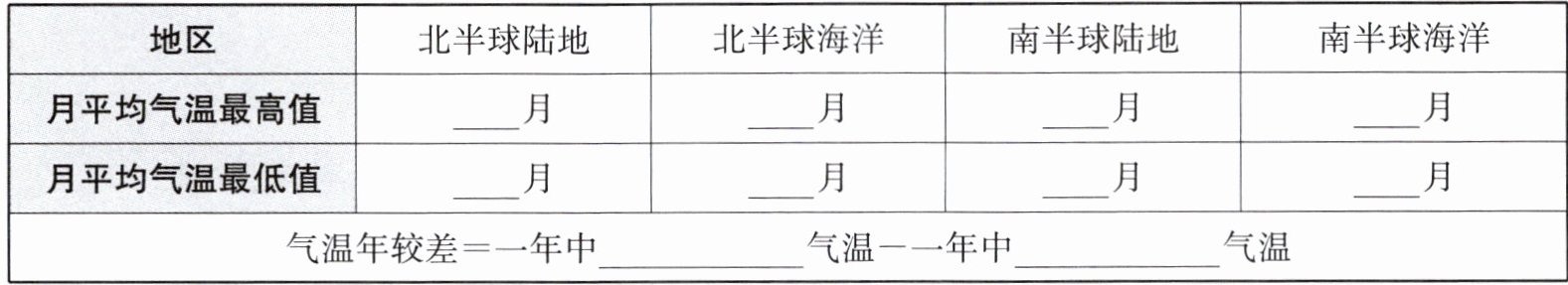 ① 在北半球气温年变化图(图1)和南半球气温年变化图(图2)中分别圈一圈最高气温和最低气温。