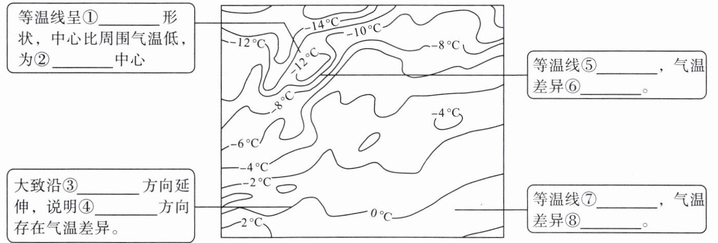 (2)①闭合 ②低温 ③东西 ④南北 ⑤密集 ⑥大 ⑦稀疏 ⑧小