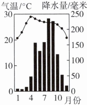 湄南河平原是世界水稻的重要产区,水稻是一种喜温喜湿的农作物,如果气温在$10 ^ { \circ } C$以下,水稻就无法正常生长。一般而言,水稻从播种到收割需4个月左右。读湄南河平原气温年变化曲线和各月降水量柱状图,完成$1 \sim 2$题。