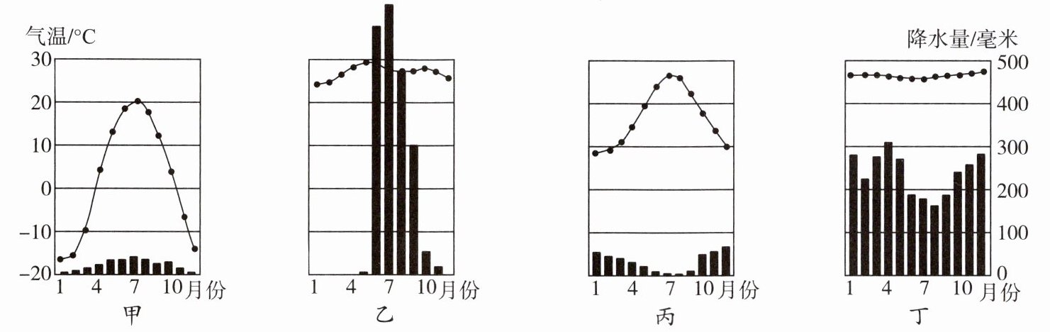 (1)题,根据柯本提出的气温指标,乙、丁最冷月均温≥18℃,属于热带气候,丙最热月均温>10℃,最冷月均温为0—18℃,属于温暖带气候。第