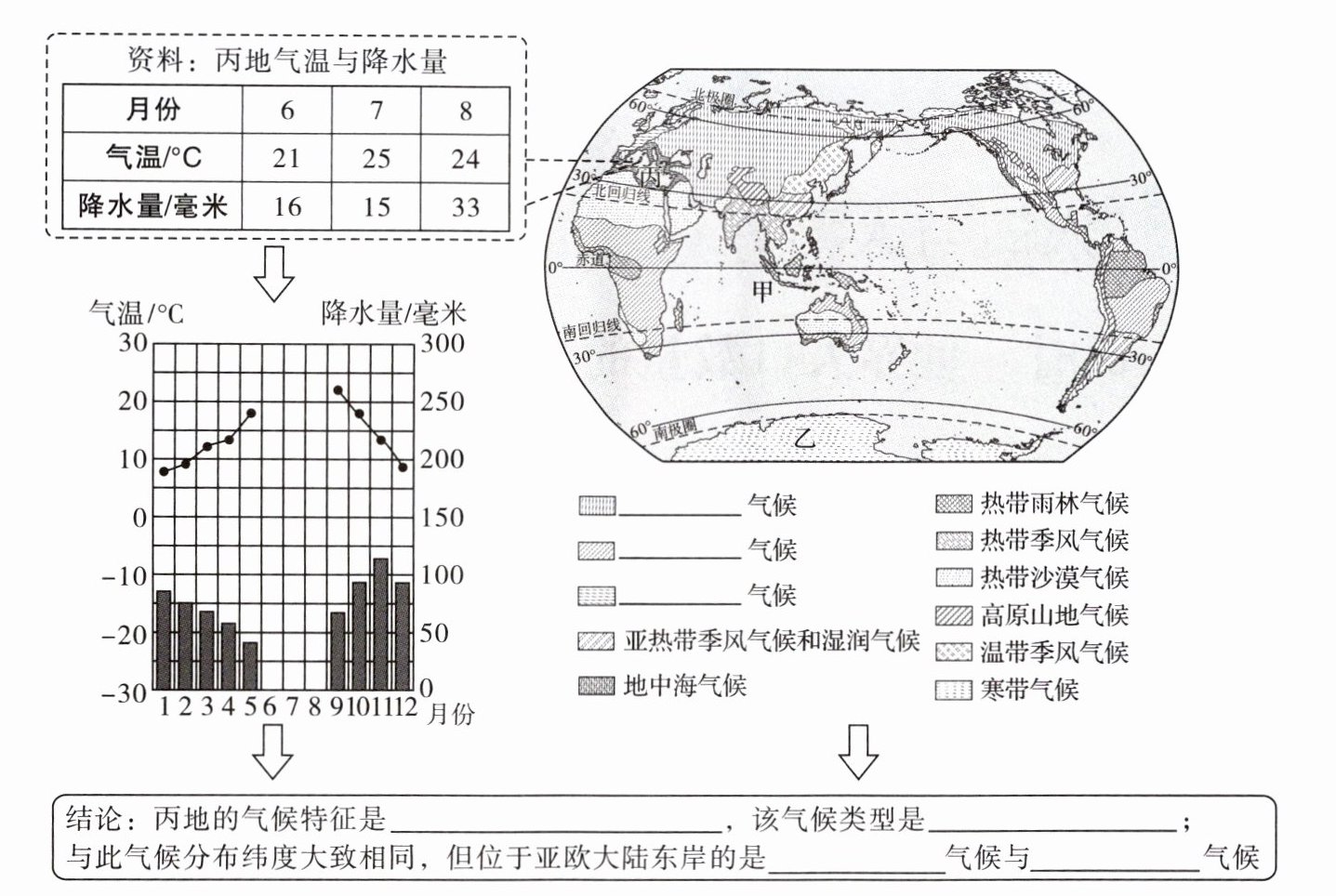 (2)题,依据丙地6、7、8月的气温和降水资料,补充完成气温曲线和降水量柱状图即可。由丙地气温曲线和降水量柱状图可知,丙地为地中海气候,其特征为夏季炎热干燥,冬季温和多雨;与此气候分布纬度大致相同,但位于亚欧大陆东岸的是亚热带季风气候和湿润气候与温带季风气候。第