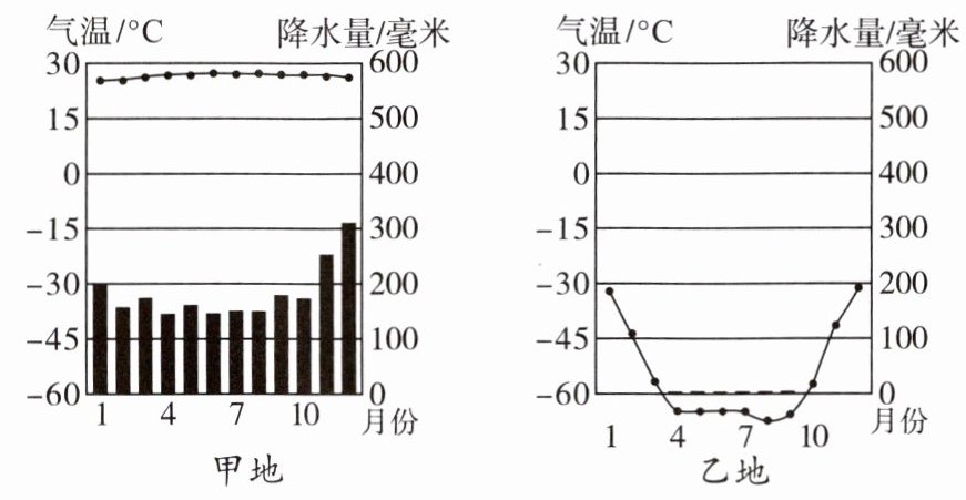 (3)对比差异:下图是“探究资料”中甲、乙两地气温曲线和降水量柱状图,分析两地气候特点有什么不同。导致两地气候差异的主要因素是什么?