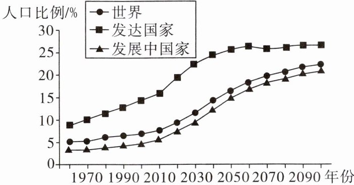 老年人口占总人口的比例,用来衡量一个国家或地区的老龄化程度。下图为世界65岁及以上人口比例变化趋势图(含预测)。读图,完成2~4题。
