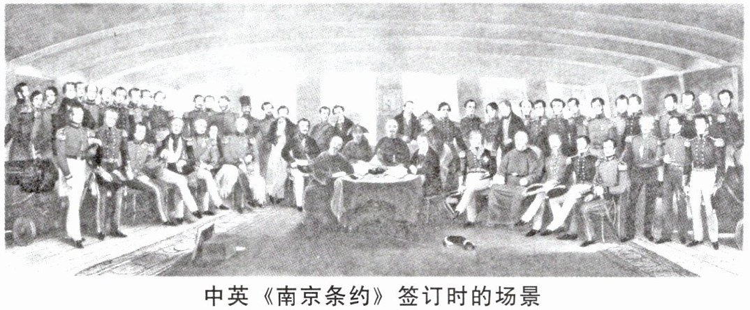 清政府在鸦片战争中失败了,被迫同英国签订中英《南京条约》。参加签约的人员英国人数多,中国人数少。英国官方授意该图的绘制和印刷,有宣扬战争胜利、美化殖民扩张的倾向。从图中还可以看出当时中英两国的服饰特点。