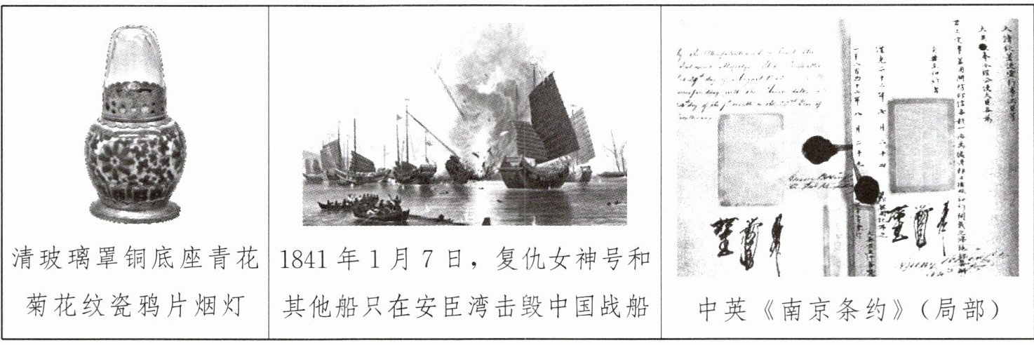 |清玻璃罩铜底座青花菊花纹瓷鸦片烟灯|1841年1月7日,复仇女神号和其他船只在安臣湾击毁中国战船|中英《南京条约》(局部)|