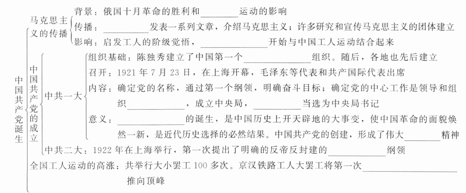 | 中国共产党诞生 | 马克思主义的传播 | 背景:俄国十月革命的胜利和______运动的影响传播:______发表一系列文章,介绍马克思主义;许多研究和宣传马克思主义的团体建立影响:启发工人的阶级觉悟,______开始与中国工人运动结合起来 |