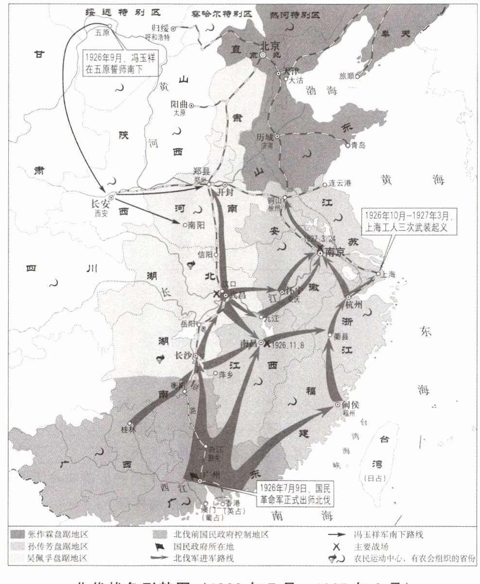 [示例一]战略战术正确。从图中可见,北洋军阀吴佩孚、孙传芳、张作霖势力分散割据。北伐军采取集中兵力、各个击破的战略,1926年先攻两湖的吴佩孚,汀泗桥贺胜桥战役击溃其主力,后讨孙传芳。该战略避免腹背受敌,发挥兵力优势,为北伐胜利进军提供保障。 [示例二]工农群众大力支持。图中标注湖南、湖北是农民运动中心,上海等城市有工人武装起义标识。北伐时工农运动蓬勃发展,湖南、湖北等地农民协会会员不断壮大,上海工人三次武装起义占领要地,工农群众在人力、物力和情报等多方面提供援助,是北伐胜利进军的群众基础。