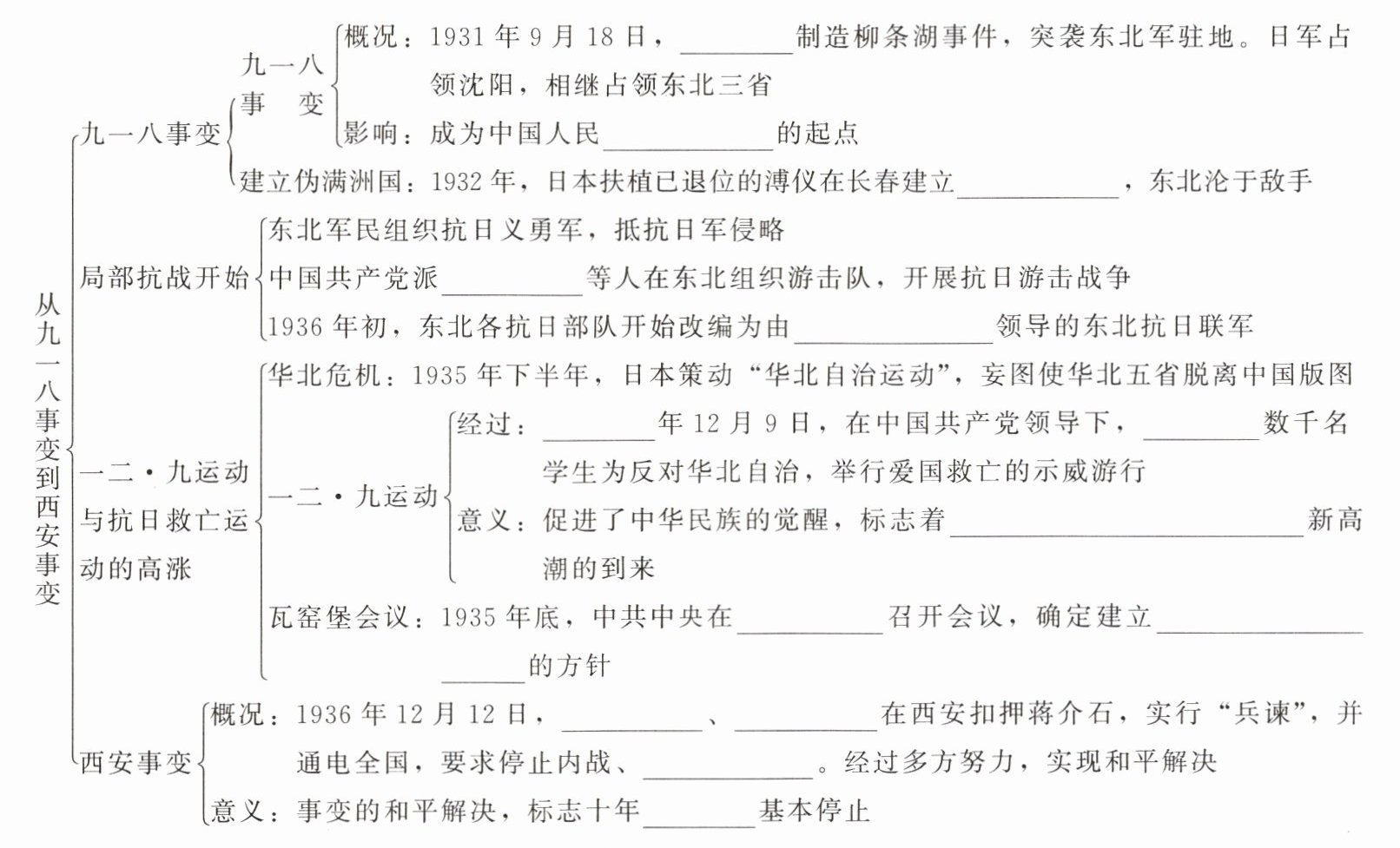 | | |一二·九运动|经过:____年12月9日,在中国共产党领导下,____数千名学生为反对华北自治,举行爱国救亡的示威游行|