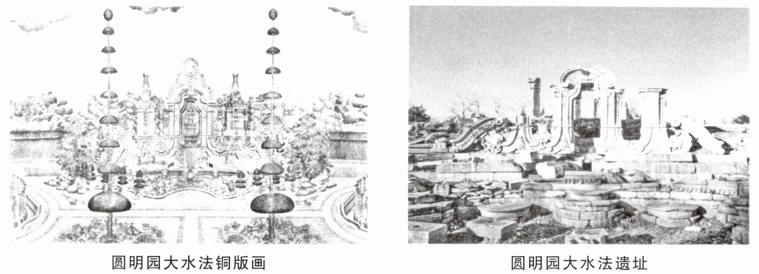 下图所示为圆明园大水法铜版画和圆明园大水法遗址。大水法位于圆明园长春园北部的西洋楼景区,是清代中西建筑艺术融合的典范。由欧洲传教士郎世宁等设计监造,中国工匠历时十余年施工营建,最终于乾隆二十四年(1759年)竣工。作为皇帝观赏喷泉的专属场所,其主体以石龛为背景,建筑群设计精妙:石龛门洞下方的大型狮子头喷泉可形成七层梯状水帘;前方椭圆形菊花纹喷水池中,铜铸梅花鹿以鹿角喷射八道水柱,两侧十只铜狗口中喷水柱直射鹿身,辅以东西两端卷尾铜兽,构成“猎狗逐鹿”的景观;左右两座十三层方形喷水塔周设44根铜管。1860年,英法联军劫掠圆明园,大水法遭到严重破坏。现残存的汉白玉石柱与雕花构件仍显昔日辉煌,是中国近代史的重要见证。