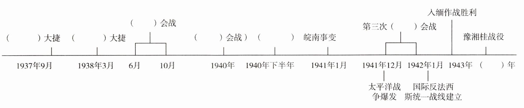 | ( ) 大捷 | ( ) 大捷 | ( ) 会战 | ( ) 会战 | ( ) | 皖南事变 | 第三次 ( ) 会战 | 入缅作战胜利 | 豫湘桂战役 | | | |