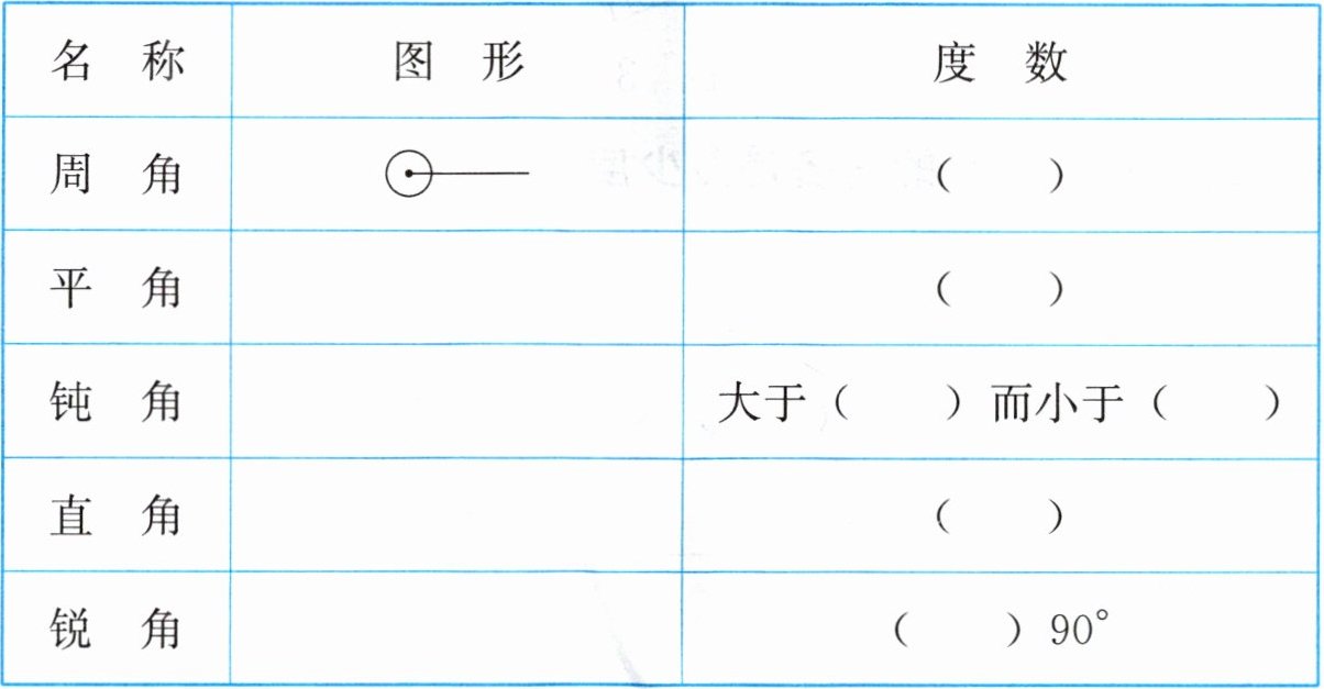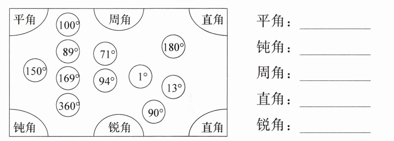 平角:180° 钝角:100° 150° 169° 94° 周角:360° 直角:90° 锐角:1° 13° 89° 71° 1°<13°<71°<89°<90°<94°<100°<150°<169°<180°<360°