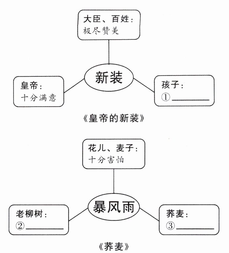 2. 阅读以上两篇童话,分析文中人物对“新装”“暴风雨”的情感态度,完成下面的“阅读导引”图。