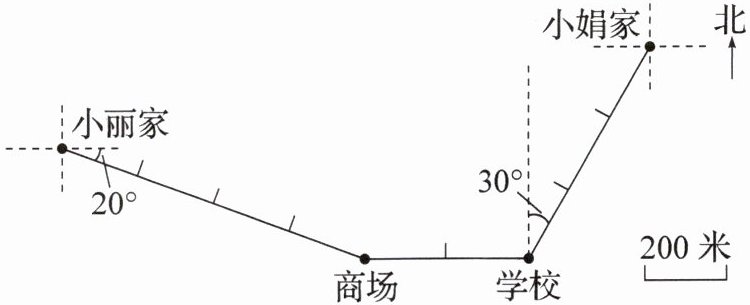 (1)健身房在王叔叔家北偏西60°方向上;公司在王叔叔家西偏南50°方向上。(2)200×10=2000(m)