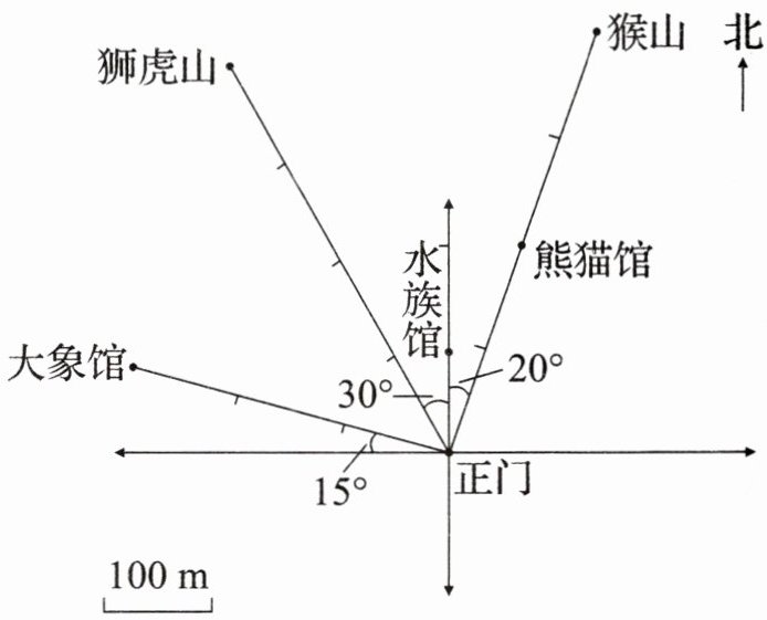 )5. 大象馆在正门的西偏北 $ 15^{\circ} $ 方向 $ 300 \mathrm{~m} $ 处。(