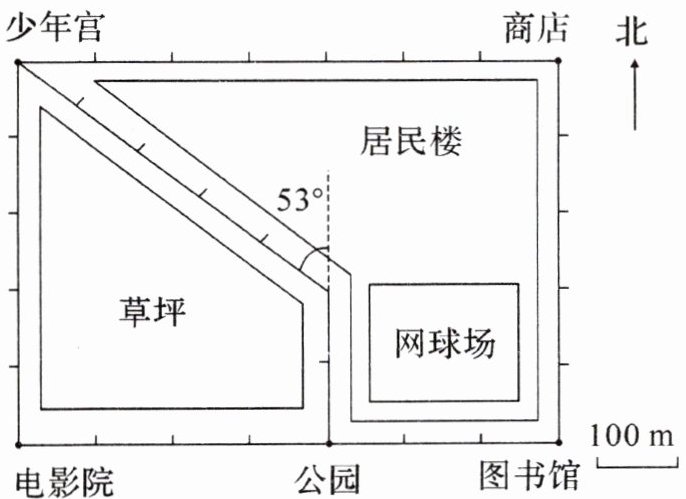 方向走,经过居民楼到商店;从公园向东走300m到图书馆,再向北走500m到商店;从公园向西走400m到电影院,再向北走500m到少年宫,最后向东走700m到商店。