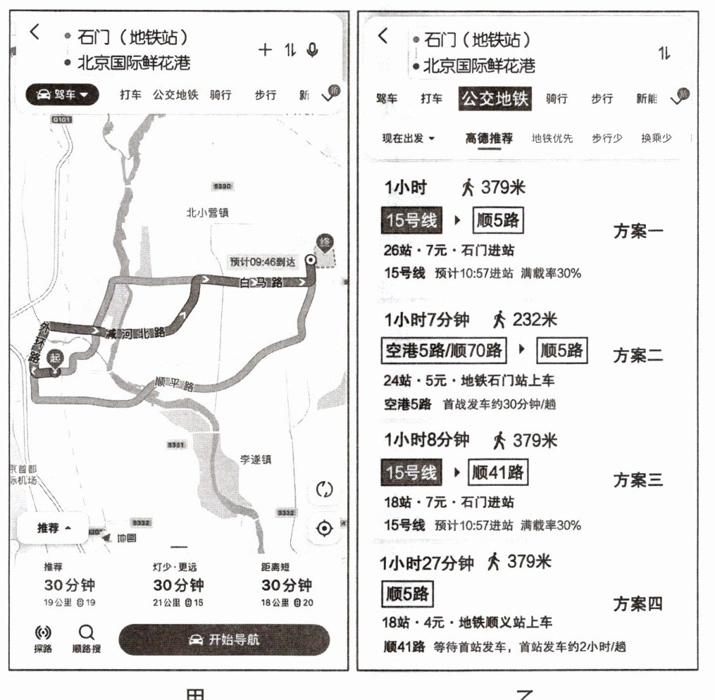 【例题】 2023年北京菊花文化节在位于顺义的北京国际鲜花港开幕,国庆假期,明明一家计划到北京国际鲜花港去赏花。明明打开导航查询,甲图为驾车路线,乙图为公交地铁推荐的四种方案。读图完成下列问题。