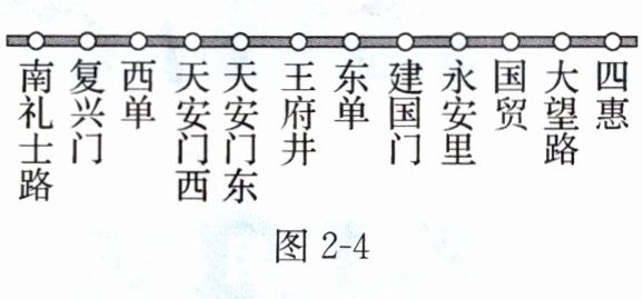 10. (北京东城期中)图2-4为北京市地铁1号线地图的一部分. 某天,嘉嘉同学参加地铁志愿者服务活动,从西单站出发,本次志愿者服务活动结束时,从A站出站,如果规定向右为正,向左为负,当天的乘车站数按先后顺序依次记录如下(单位:站):+5,-4,+4,-6,+9,-2,-7,+1.