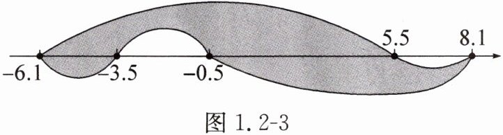 9. 小明写作业时不慎将墨水滴在已画好的数轴上。试根据图1.2 - 3中的数据,确定被墨迹遮盖住的整数共有几个,并写出分别是哪些整数。