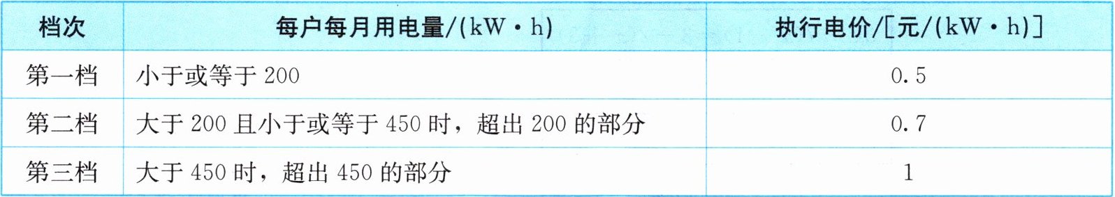 |档次|每户每月用电量/($kW\cdot h$)|执行电价/[元/($kW\cdot h$)]|